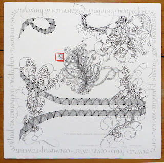 Notice how Lesley continued to use the hollibaugh method of drawing behind to layer her tangles one behind another and how the text basically disappears under paradox: