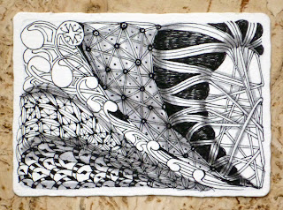 When I sit down with a blank tile, I like to have an idea of the tangles I might use. I usually start out with one of my "mac 'n cheese" tangles, you know . . . "comfort tangles." Some of mine are mooka, purk, tripoli, poke leaf and maybe a bit of bales . . . old standbys. When I get a rhythm going I might throw in something different, maybe a new one I have seen in passing or a tangleation of one of Rick's (making his straight lines a bit curvier! :-) or just some auras around to elaborate existing tangles. But while I'm tangling, I just look at my tile . . . I rarely ever look up. Perhaps this uninterrupted concentration/focus on one place is one of the ways Zentangle works its magic for me.