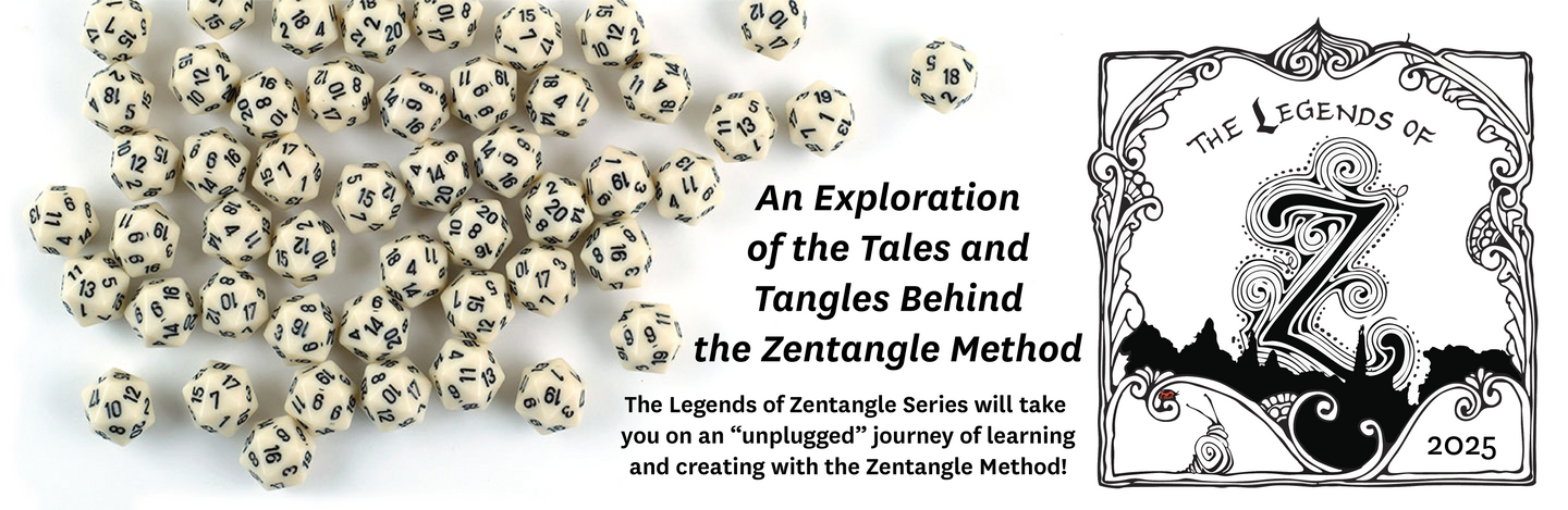 One of our earliest additions to the Zentangle Method was the twenty-sided die and accompanying legend card. This was added as a way to eliminate the roadblock of not knowing what to tangle next and to inspire challenges and ideas. For years this was a staple in our original kit. In 2020 we created Project Pack No.10 around the theme and this year we continued the story of Zentangle Legend in 2024 with the introduction of The Legends of Zentangle Collection Box.