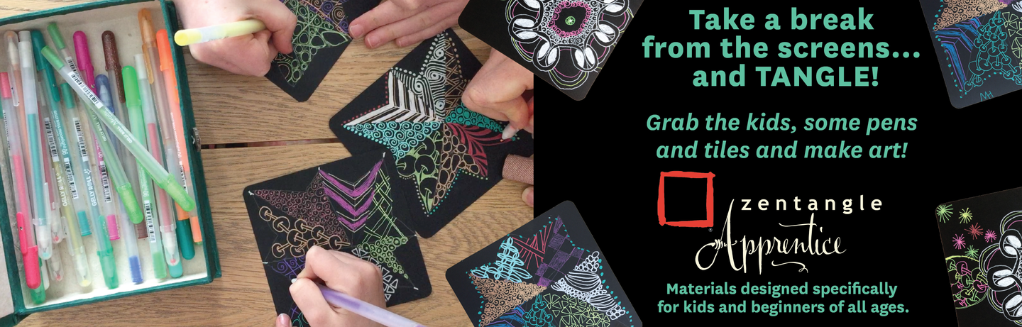 We truly appreciate the need for everyone to unplug and the Zentangle Apprentice Kit was developed with that in mind, however, we understand that to get started, sometimes it is helpful to have some guidance. We have curated a list of videos especially for kids but truly they are for anyone. We invite you to explore tangling along with Molly and her daughters, and lots of color as you follow along with the videos!