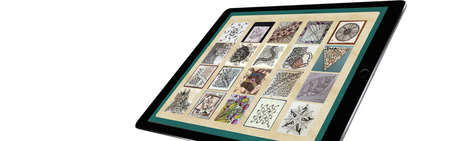 A: The Global Zentangle Waterfall is a live mosaic of tiles from the world-wide Zentangle Community. Sit back and watch tiles change to find endless inspiration from all over the world. You can pause Waterfall mode anytime by touching the display. Then, you can touch any tile to find out more about it and the artist who created it. You can access the Global Zentangle Waterfall from anywhere in the app by touching the red Zentangle logo in the upper left corner of the display.